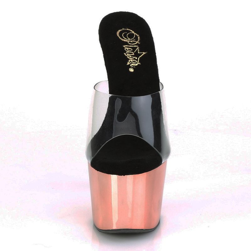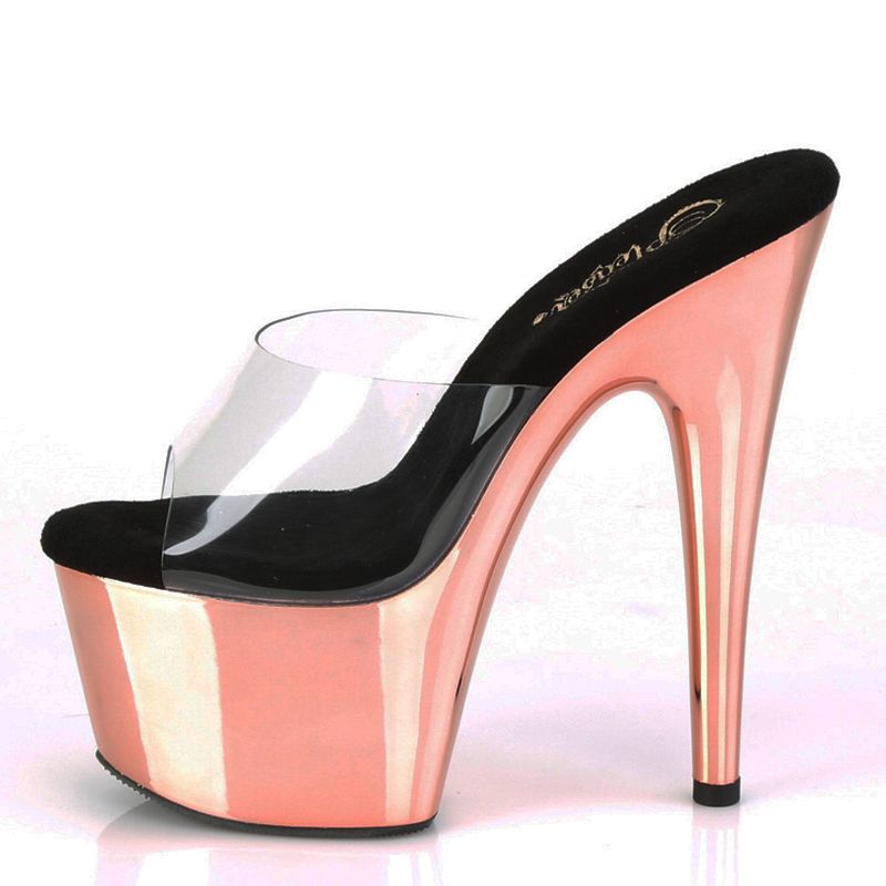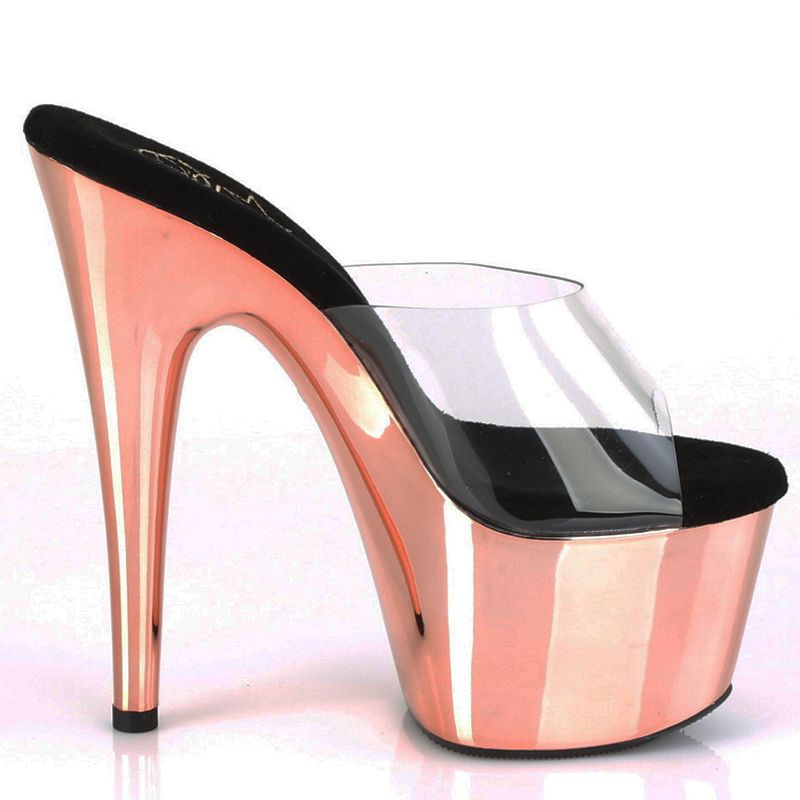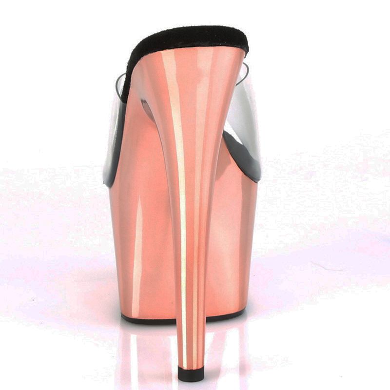 Porter des chaussures Stripper dans l'intimité de votre couple, c'est l'assurance de séduire votre partenaire de manière très inattendue. Ces mules transparentes fascinent toujours les hommes qui aiment les talons hauts, vos pieds sont mis en valeur avec une tendance fétichiste dont la marque américaine Pleaser à le secret, un talon fin vertigineux qui allonge nos jambes et sculpte notre démarche ou notre danse, une plateforme avant qui diminue fortement la cambrure, notez les finitions chromées roses du plus bel effet, confort maximal avec la semelle intérieure microfibre exclusive qui évite tout risque d'échauffement. Une exclusivité de notre shop, disponible dans différentes couleurs, sans oublier, pour celles qui chaussent grand, les pointures extrêmes sont vendues sans aucune majoration de prix.