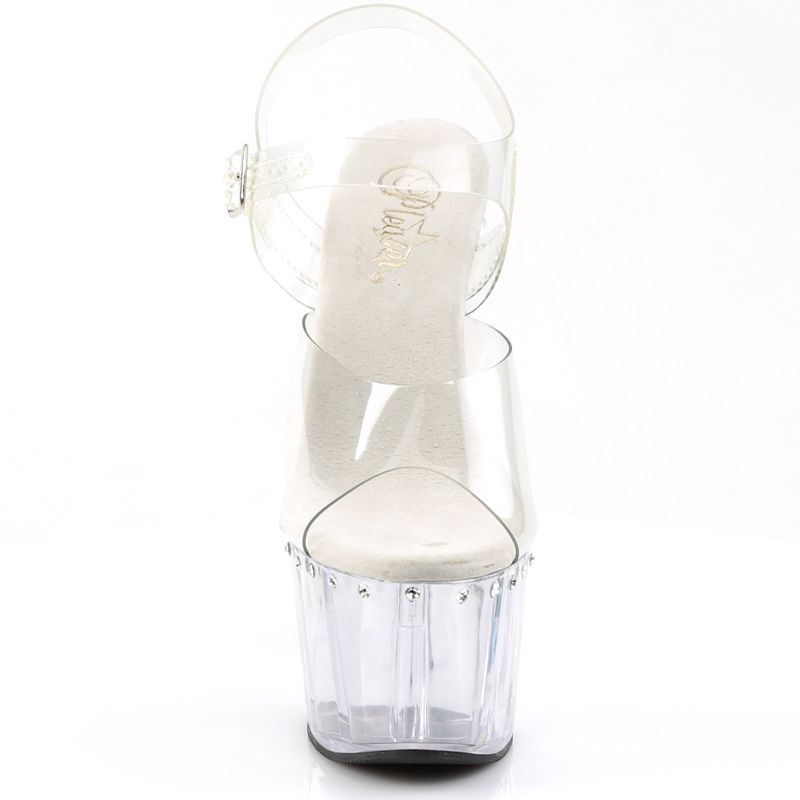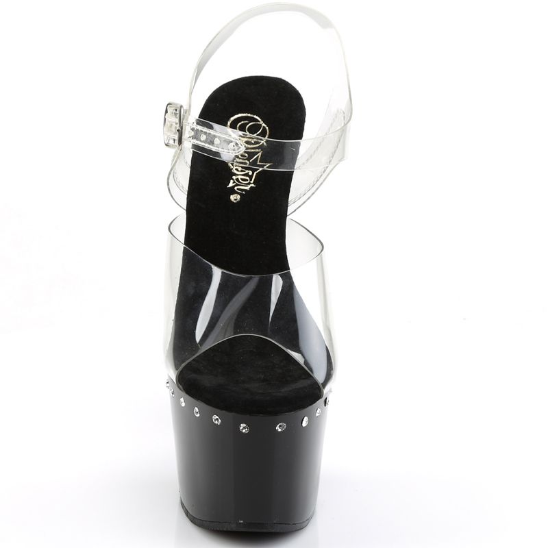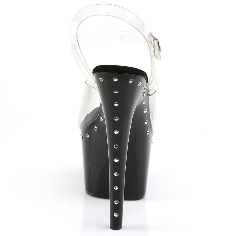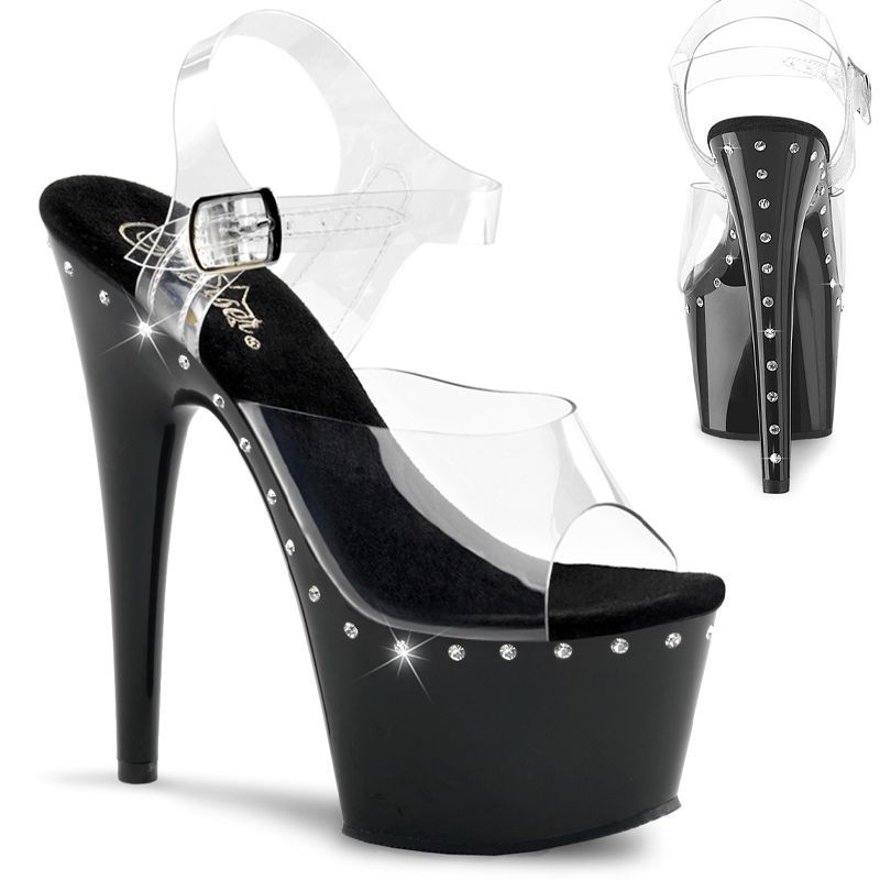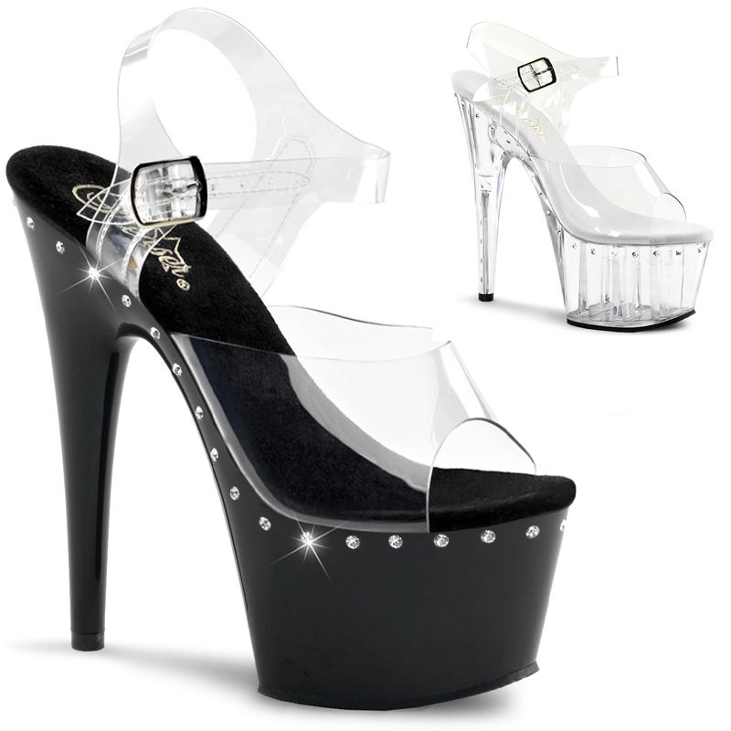 Le design est basé sur le contraste : la sangle en Noir ou la sangle en Transparent (Clair) combinée à la ligne de strass unique. Les strass chatoyants courent le long du bord de la plateforme et du talon, assurant que l'œil est attiré vers la structure vertigineuse de la chaussure. C'est l'accessoire idéal pour les événements de Pole Dance et les soirées.