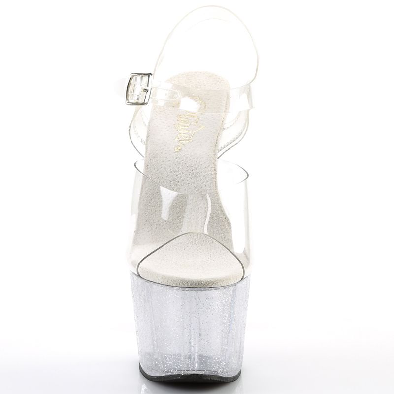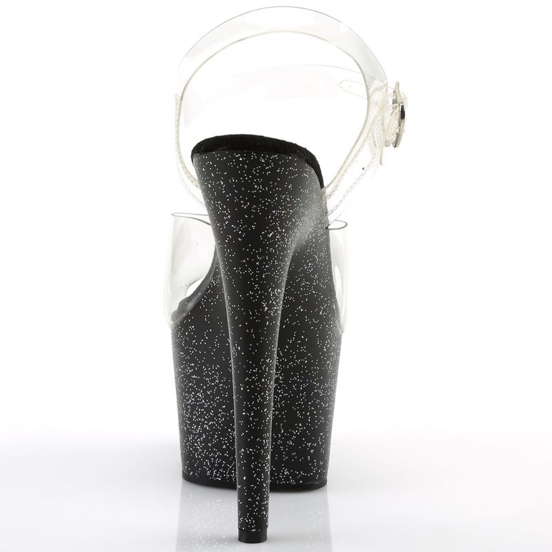 Le corps de la sandale est recouvert de mini paillettes irisées qui créent une illusion de mouvement et de couleur lorsque la lumière les frappe. Contrairement aux modèles entièrement colorés, l'association des paillettes irisées avec le design clair/noir confère à l'ADORE-708MG une polyvalence qui la rend appropriée pour des occasions spéciales, des événements de Pole Dance ou simplement un look de soirée glamour.