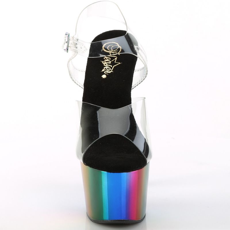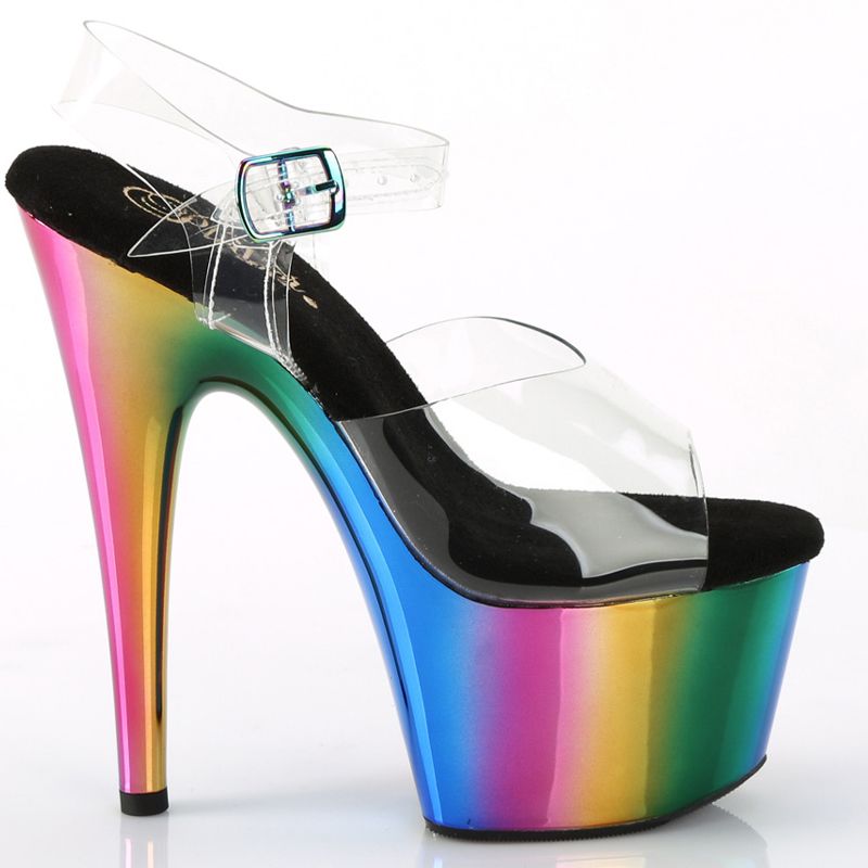 Dotée d'un talon Stiletto de 17.8 cm et d'une plateforme audacieuse de 7 cm, l'Adore-708RC se distingue par son fond de plateforme chromé arc-en-ciel qui offre une touche de couleur accrocheuse. La sangle de cheville est transparente et multicolore, ajoutant un charme ludique et élégant.