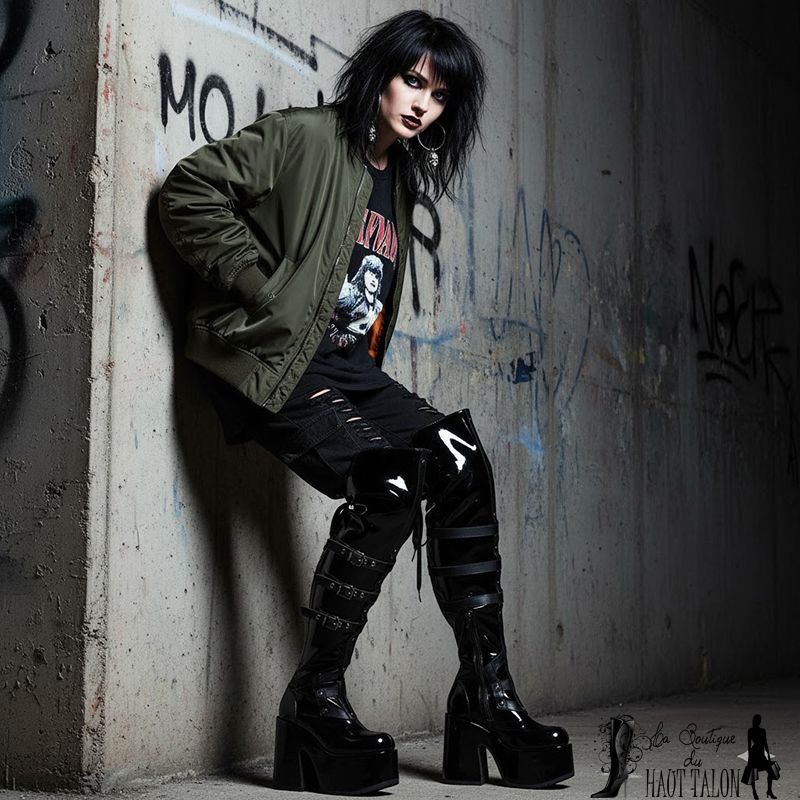 Adoptez un style audacieux avec les bottes cuissardes CAMEL-308 au fini noir vernis, conçues avec un talon épais et une plateforme imposante pour un look affirmé.